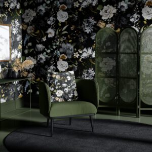 Siyah zemin üzerine yerleştirilmiş beyaz çiçek desenleriyle bu duvar kağıdı, yaşam alanlarına zarafet ve derinlik katıyor. Giyinme odası, salon ya da özel köşelerinizde güçlü bir stil oluşturur. Kendinden yapışkanlı veya geleneksel tutkal uygulamalı seçenekleriyle sunulur.