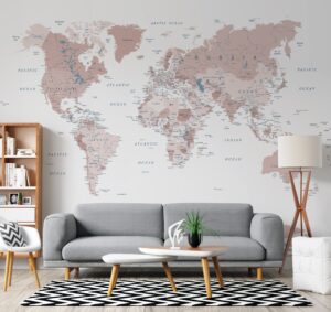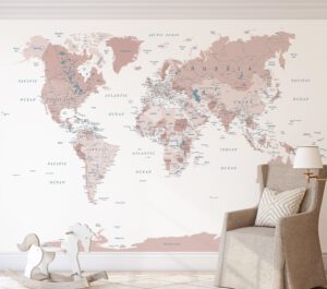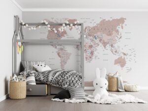 Zarif toz pembe ve beyaz tonlarında hazırlanmış bu minimalist dünya haritası duvar kağıdı, modern ve sade mekanlar için mükemmel bir dekorasyon seçeneğidir. Ülkeler ve şehirler detaylı bir şekilde gösterilmiştir. Kendinden yapışkanlı vinil veya geleneksel tutkallı duvar kağıdı seçenekleri ile kolayca uygulanabilir. Salonlar, ofisler, çalışma odaları ve butik alanlar için ideal. Yüksek çözünürlüklü baskı kalitesi sunulmaktadır ve özel ölçülerde üretim yapılabilir.