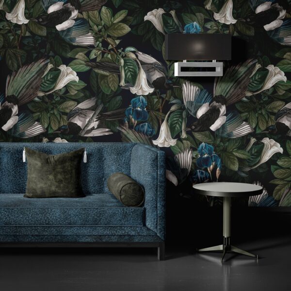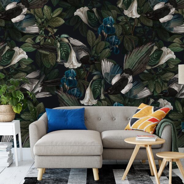 Saksağan Kuşları ve Borazan Çiçekli Koyu Botanik Duvar Kağıdı