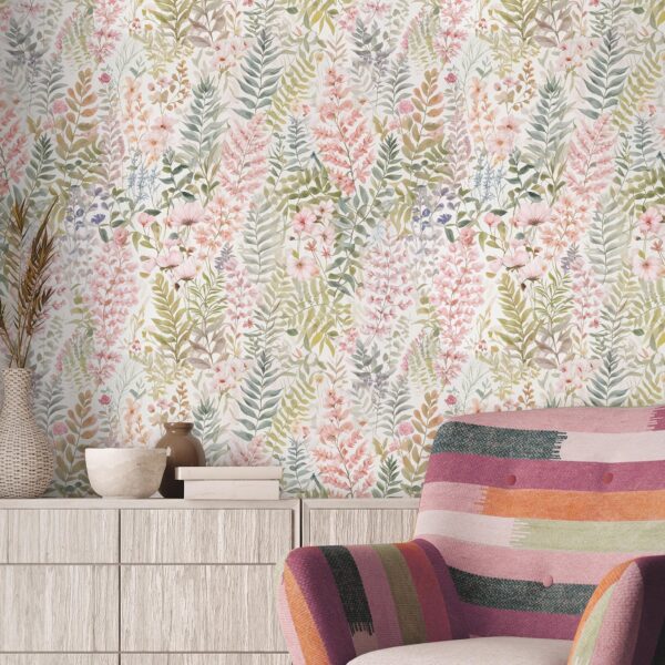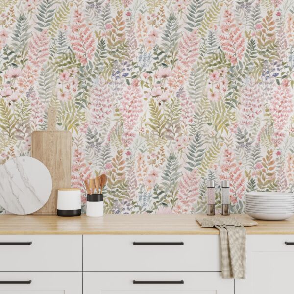Pastel Botanik Çiçek ve Yaprak Desenli Duvar Kağıdı