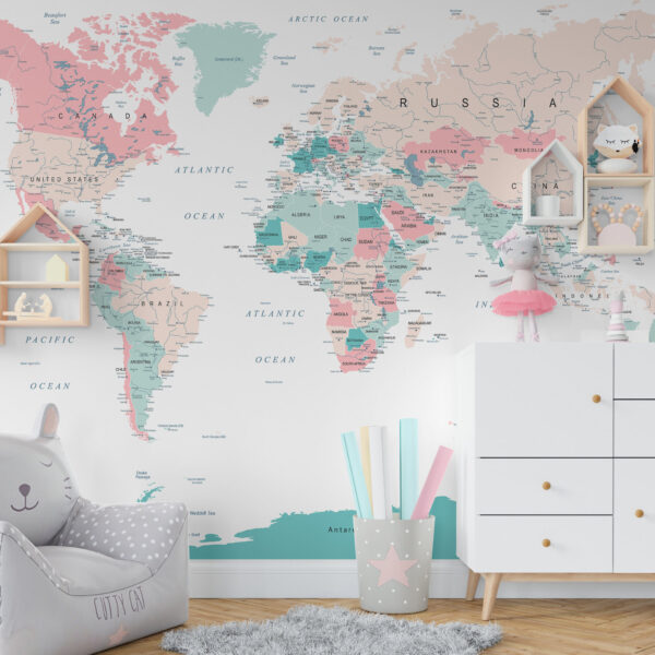 Pastel Yeşil & Pembe Dünya Haritası Duvar Kağıdı