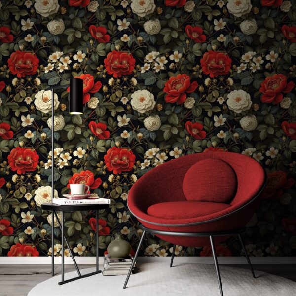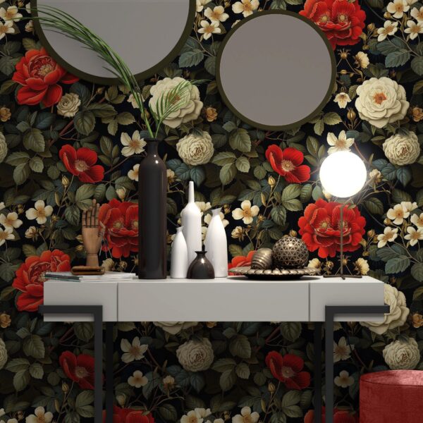 Siyah Zemin Üzerine Kırmızı ve Krem Çiçekli Duvar Kağıdı
