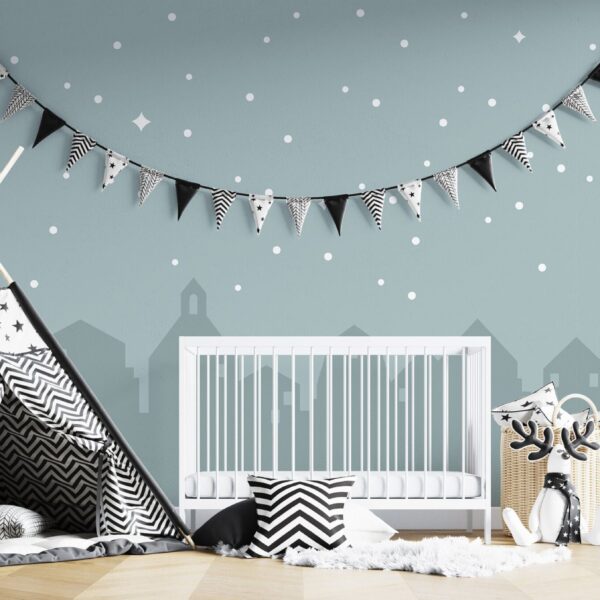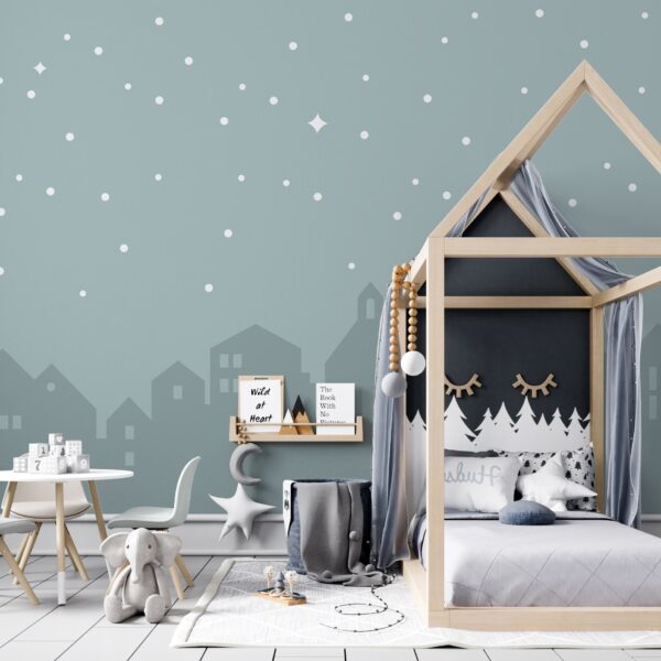 Yıldızlı Gece ve Köy Desenli Duvar Kağıdı