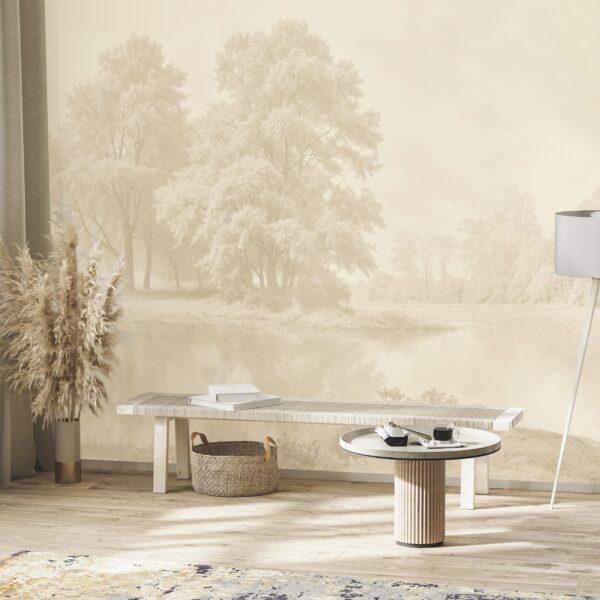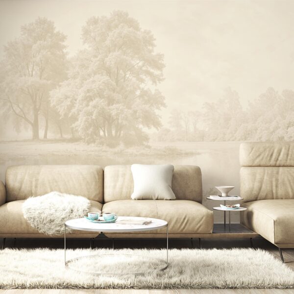 Yumuşak Bej Tonlarda Sisli Doğa Manzarası Duvar Kağıdı