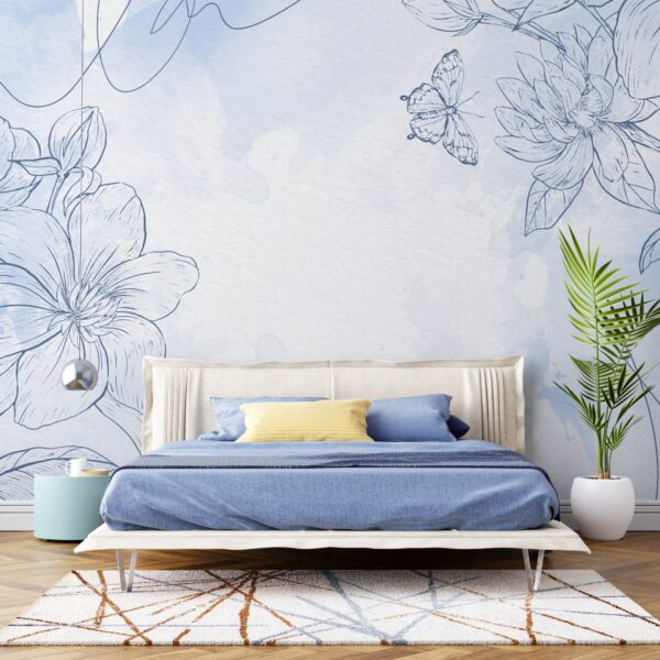 Mavi Çizgisel Çiçek ve Kelebek Duvar Kağıdı
