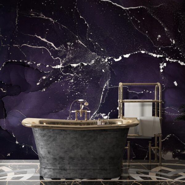 Derin Mor ve Gümüş Damarlı Lüks Mermer Desen Duvar Kağıdı