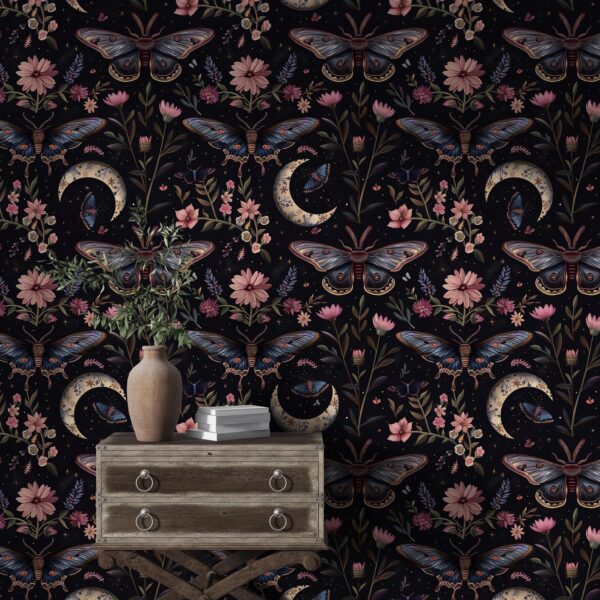 Mistik Güve ve Ay Desenli Koyu Renk Duvar Kağıdı – Büyülü Atmosfer