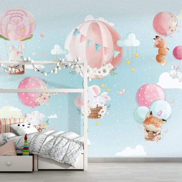 Pastel Uçan Balon ve Hayvanlar Temalı Duvar Kağıdı
