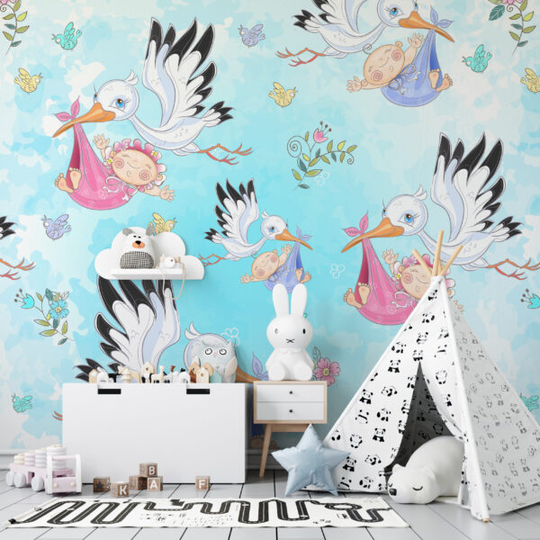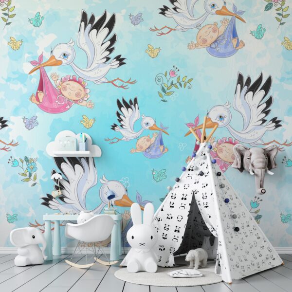 Leylek ve Bebek Temalı Duvar Kağıdı