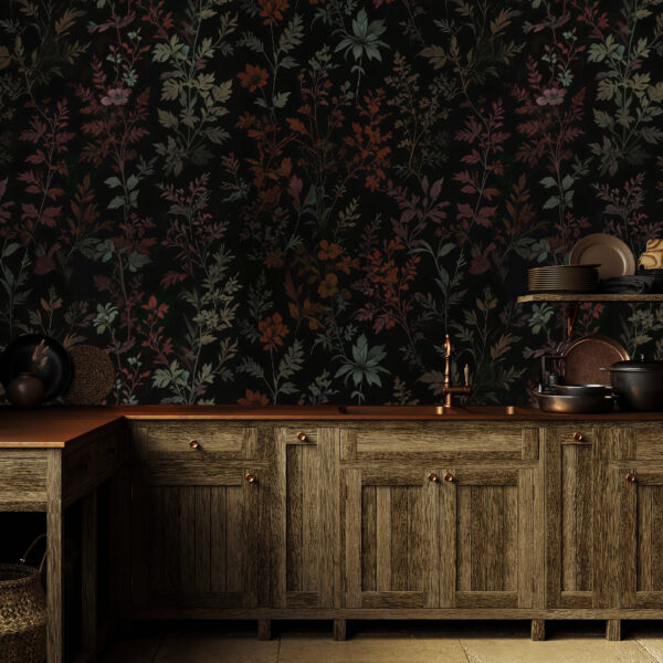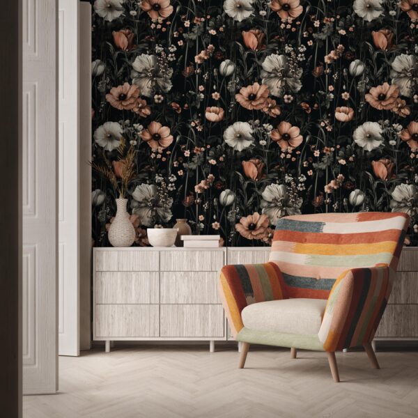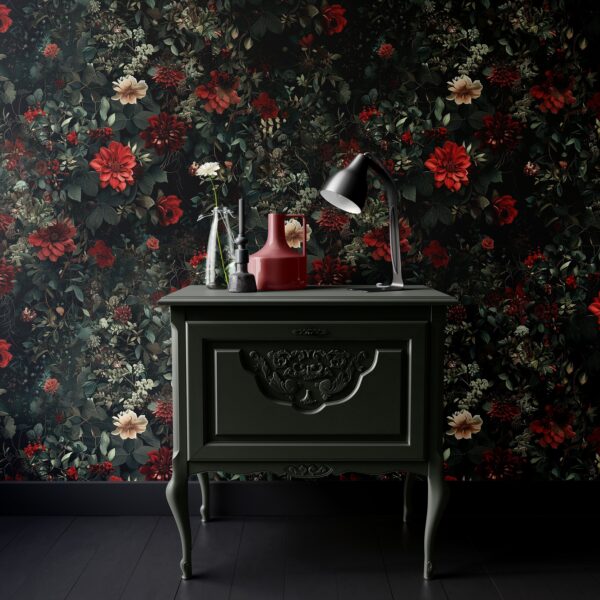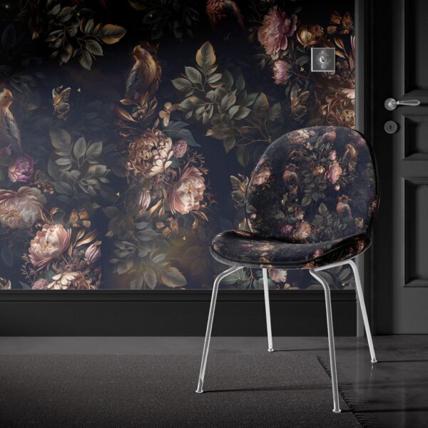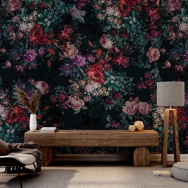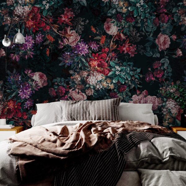 Koyu Zeminli Barok Çiçek Desenli Duvar Kağıdı
