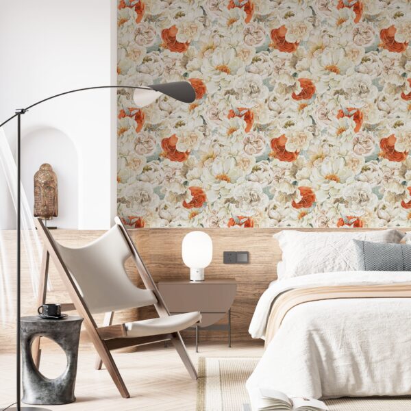 Krem ve Kiremit Rengi Büyük Çiçekli Vintage Duvar Kağıdı