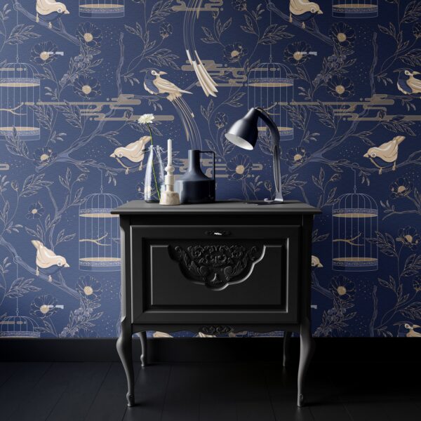Lacivert Altın Kuş ve Kafes Desenli Lüks Duvar Kağıdı