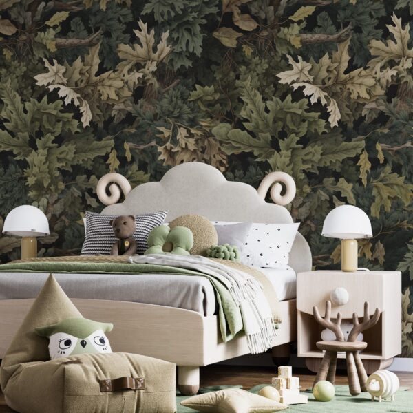 Koyu Yeşil Meşe ve Orman Yaprakları Desenli Duvar Kağıdı