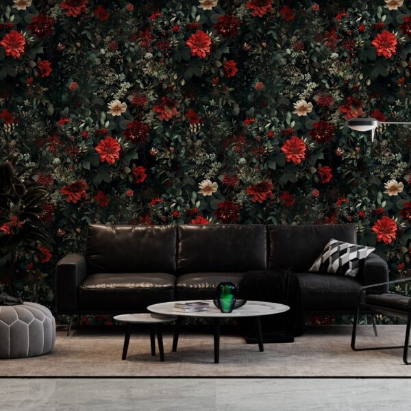 Koyu Zemin Kırmızı & Krem Çiçekli Botanik Duvar Kağıdı