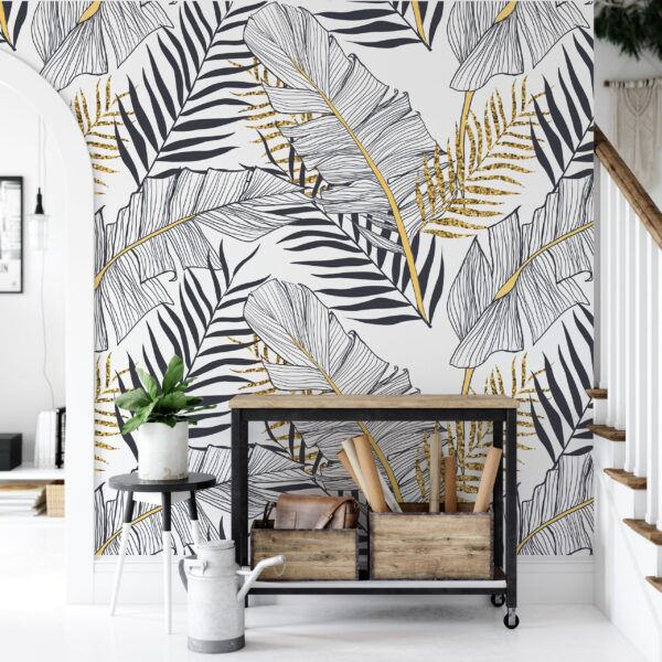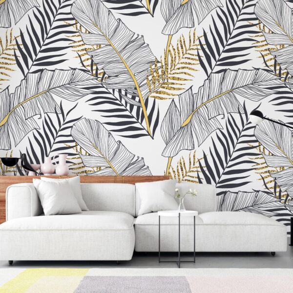 Tropikal Siyah ve Sarı Yaprak Desenli Duvar Kağıdı