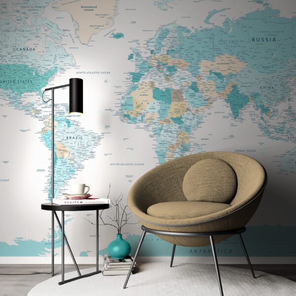 Turkuaz Mavi Krem Tonları Dünya Haritası Duvar Kağıdı