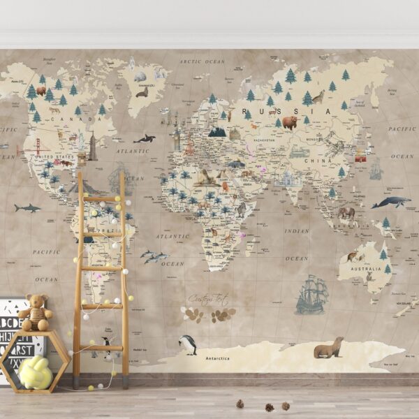 Vintage Tarzı Hayvanlı ve Anıtlı Dünya Haritası Duvar Kağıdı