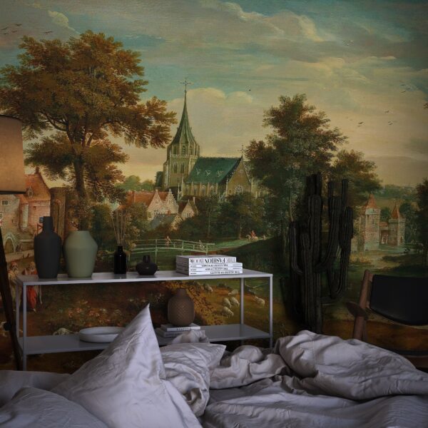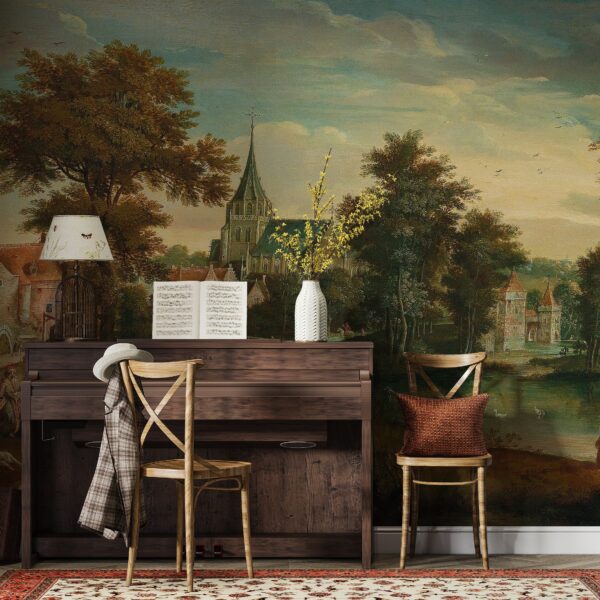 Vintage Avrupa Köy Manzarası Tablo Duvar Kağıdı