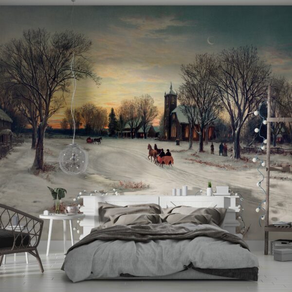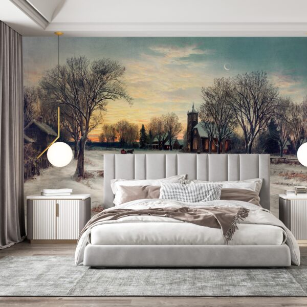 Vintage Kış Manzarası Duvar Kağıdı – Karlı Köy Tablosu