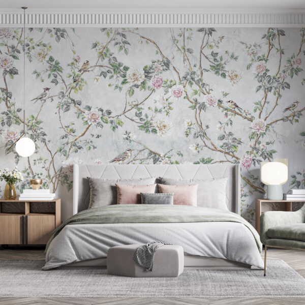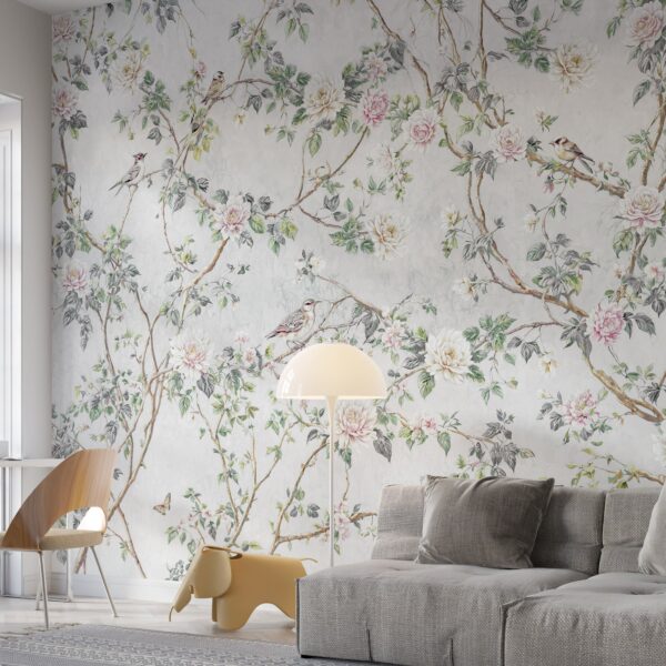 Vintage Botanik Kuş ve Çiçek Desenli Duvar Kağıdı | Açık Zemin