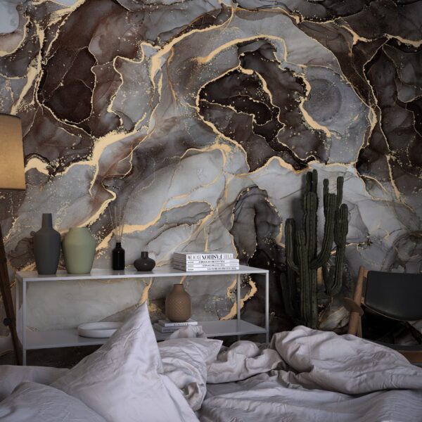Kahverengi ve Altın Damarlarıyla Mermer Desenli Duvar Kağıdı
