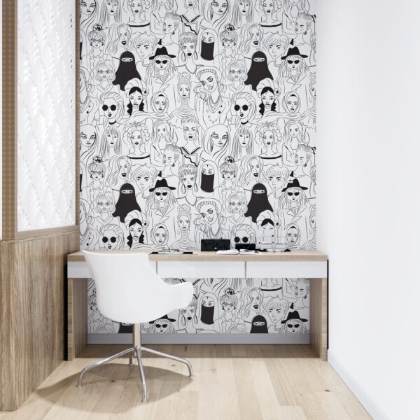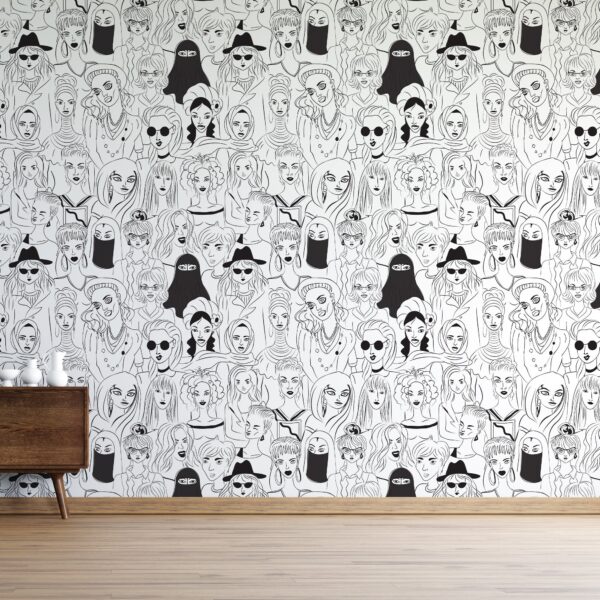 Kadın Figürlü Siyah Beyaz Çizgisel Duvar Kağıdı