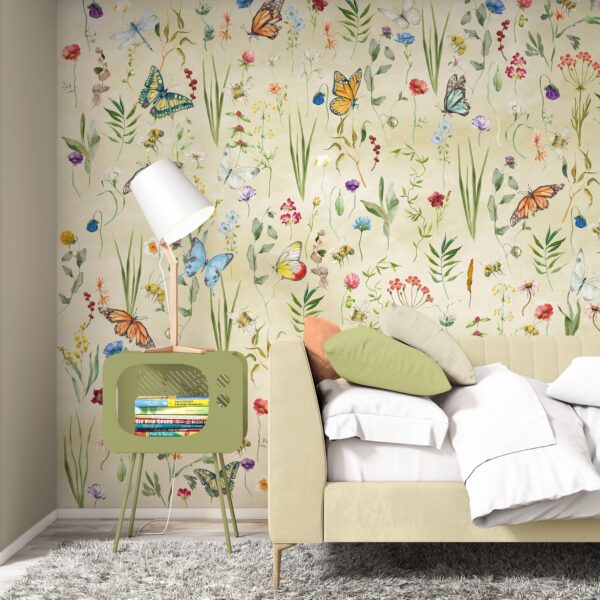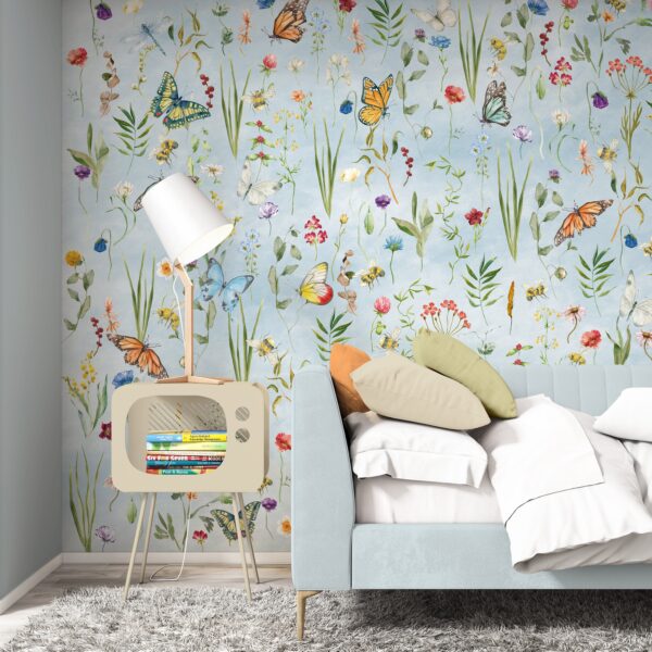 Kelebek ve Kır Çiçekleri Desenli Duvar Kağıdı