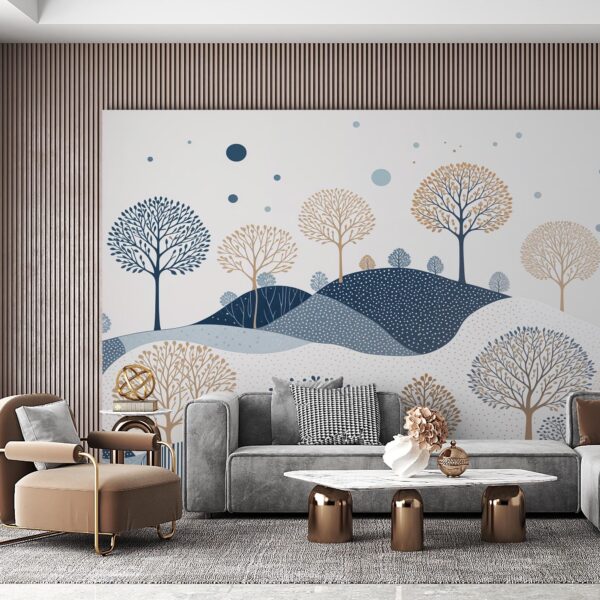İskandinav Stili Mavi Tepeler ve Ağaçlar Duvar Kağıdı