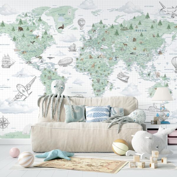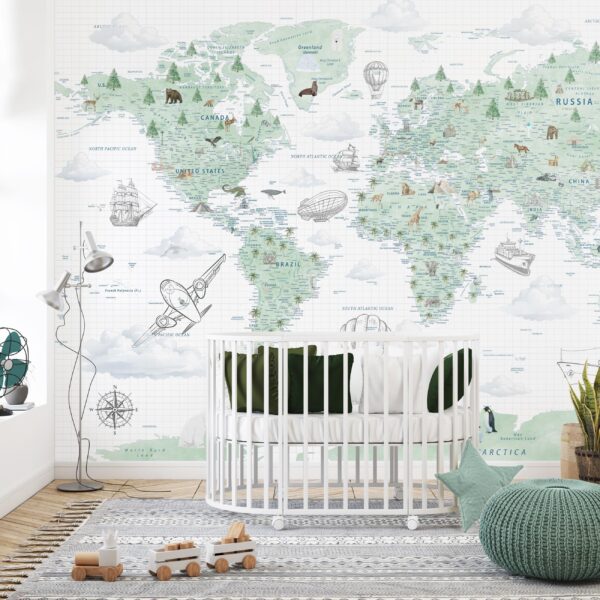 Sevimli Yeşil Dünya Haritası Bebek Odası Duvar Kağıdı