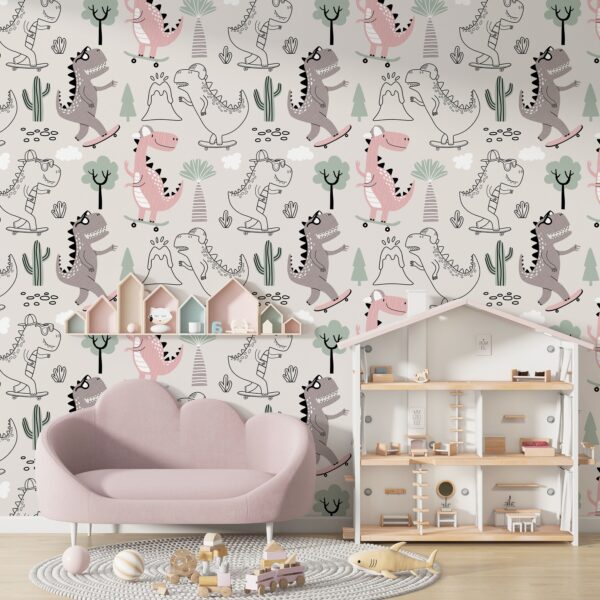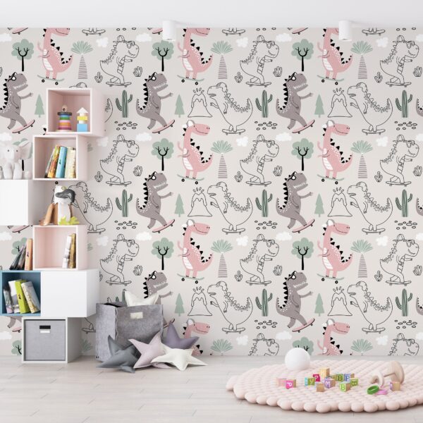 Sevimli Kaykaylı Dinozor Desenli Çocuk Duvar Kağıdı