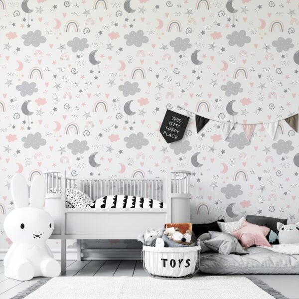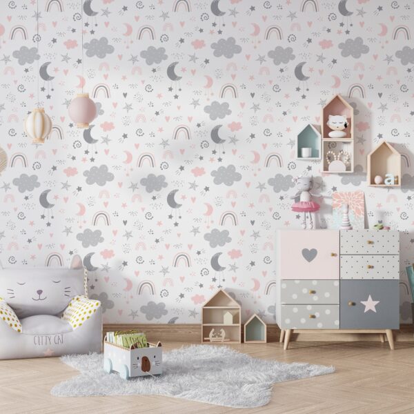 Pastel Bulut, Ay ve Gökkuşağı Desenli Çocuk Duvar Kağıdı