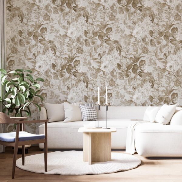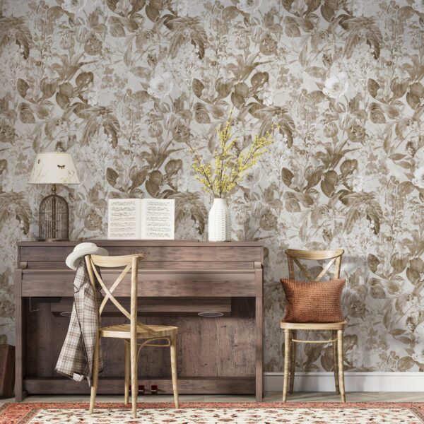 Sepya Tonlarda Vintage Çiçek Desenli Duvar Kağıdı