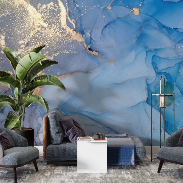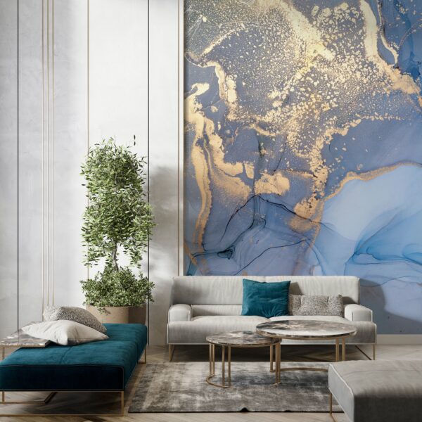 Mavi Altın Akışkan Soyut Desenli Lüks Modern Duvar Kağıdı