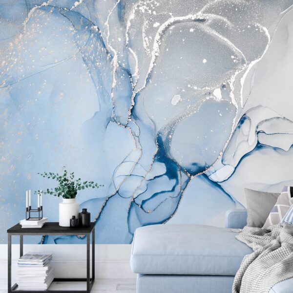 Mavi ve Gümüş Akışkan Soyut Desenli Lüks Duvar Kağıdı