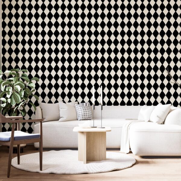 Siyah Beyaz Fırça Efektli Harlequin Baklava Desen Duvar Kağıdı