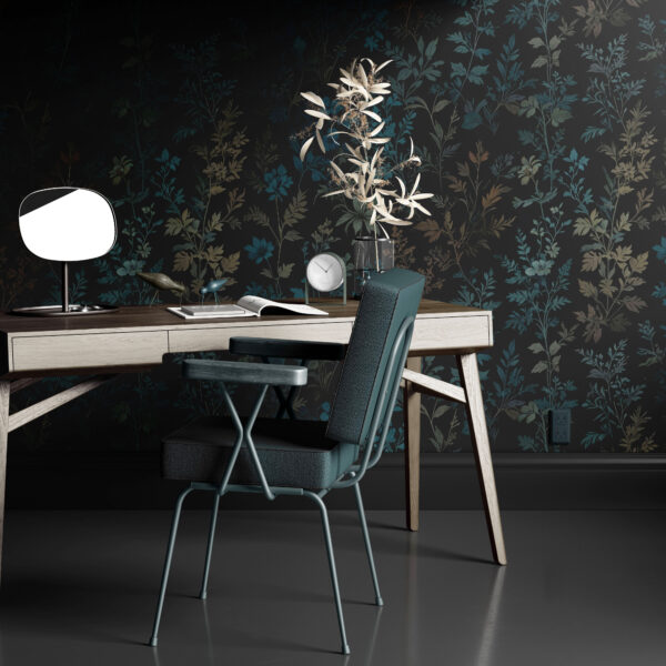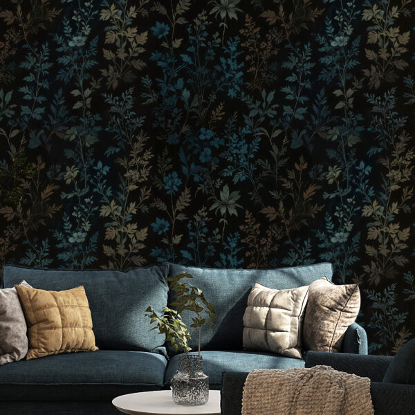 Mavi Tonlu Koyu Floral Duvar Kağıdı