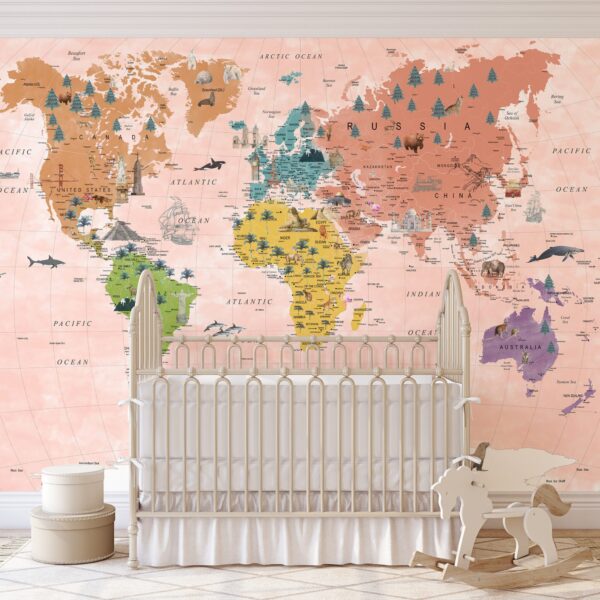 Pastel Mavi ve Pembe Hayvanlı Dünya Haritası Duvar Kağıdı
