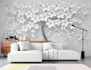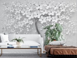 3D Beyaz Çiçekli Ağaç Duvar Kağıdı