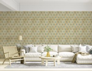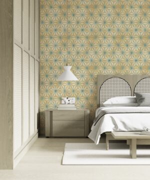 Duvarlarınıza Art Deko döneminin zamansız zarafetini ve geometrik desenlerin büyüleyici simetrisini taşıyın! Bu göz alıcı duvar kağıdı, eskitme altın sarısı bir zemin üzerine işlenmiş teal (petrol mavisi) rengindeki karmaşık yıldız ve üçgen motifleriyle mekanınıza sofistike bir hava katar. Desenlerin yarattığı derinlik ve ritim, modern ve retro tarzı birleştiren eşsiz bir atmosfer sunar.