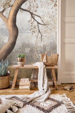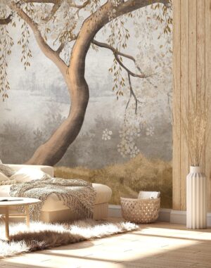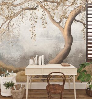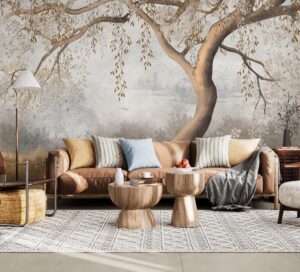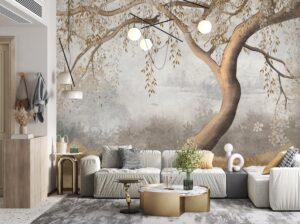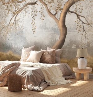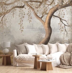 Odanızda dingin ve büyüleyici bir atmosfer yaratın. Bu eşsiz, duvar resmi etkisindeki duvar kağıdı, zarif bir ağacın altın rengi yaprakları ve arka plandaki sisli, huzurlu bir manzarayı evinize taşıyor. Sanatsal fırça darbelerini andıran dokusuyla, duvarınızı adeta bir sanat eserine dönüştürerek mekanınıza derinlik ve sakinlik katacak. Özellikle yatak odası veya dinlenme alanları için idealdir.