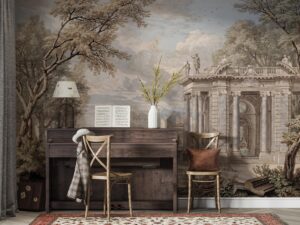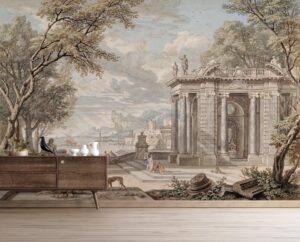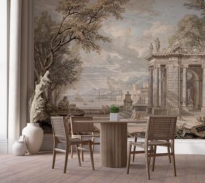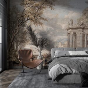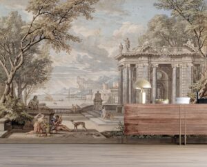 Huzurlu ve pastoral bir atmosferi duvarlarınıza taşıyan Arkadyan manzaralı klasik duvar kağıdımızla mekanlarınıza zamansız bir zarafet katın. Bu büyüleyici mural, antik dönem mimarilerini, sakin bir kıyı şeridini, yemyeşil ağaçları ve pastoral figürleri, adeta eski bir ustanın elinden çıkmış bir tablo veya çizim estetiğiyle sunar. Sepya ve doğal tonların hakim olduğu yumuşak renk paleti, dinlendirici ve sofistike bir ortam yaratır.