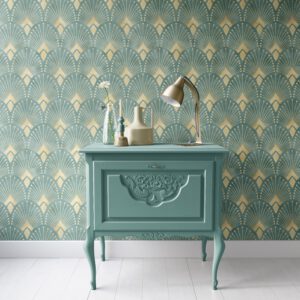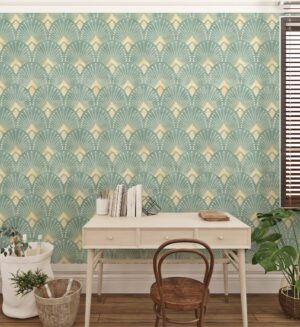 Art Deco Balık Pulu Desenli Altın Çizgili Turkuaz Duvar Kağıdı