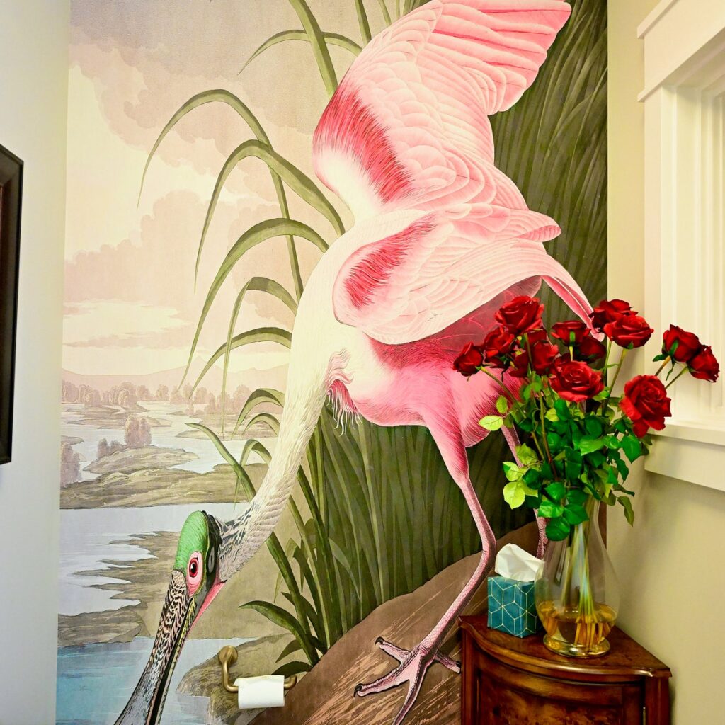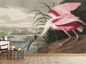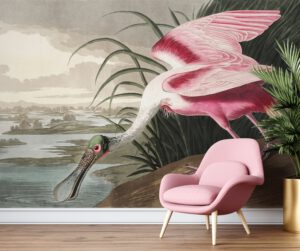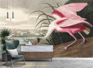 Bu dikkat çekici duvar kağıdı, John James Audubonun ikonik doğa çizimlerinden ilham alan pembe kaşıkçı kuşu illüstrasyonunu zarif tonlarla yansıtır.