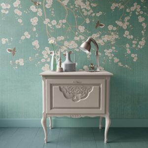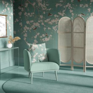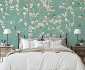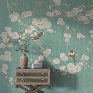 Bahar Dalı ve Kuş Desenli Duvar Kağıdı – Turkuaz Zemin