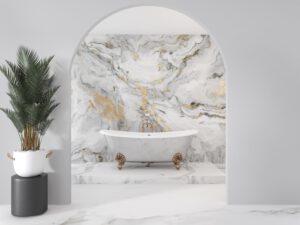 Beyaz mermer ve altın damarlarıyla tasarlanmış bu duvar kağıdı, banyo mekanınıza zarif ve lüks bir dokunuş katacak. Modern tasarımlar için mükemmel bir seçim.