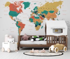 Canlı turuncu, yeşil ve kırmızı tonlarıyla hazırlanmış bu dünya haritası duvar kağıdı, mekanlarınıza enerjik ve dinamik bir atmosfer kazandırır. Retro ve modern tarzı bir araya getiren tasarımıyla genç odası, çalışma odası, salon ve stüdyo daire dekorasyonu için idealdir. Kendinden yapışkanlı vinil veya tutkallı geleneksel malzeme seçenekleriyle kolay kurulum sağlar. Yüksek çözünürlüklü baskı kalitesi sunar ve özel ölçülerde üretim imkanı bulunmaktadır.