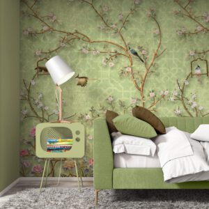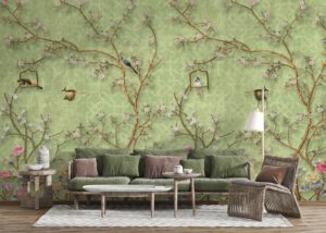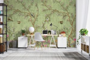Çiçekli ve Kuşlu Yeşil Duvar Kağıdı