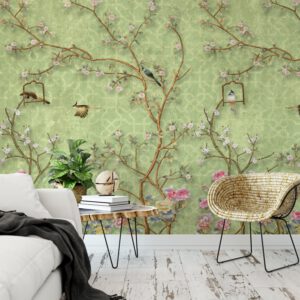 Bu yeşil tonlarındaki çiçekli ve kuşlu duvar kağıdı, doğal ve şık bir atmosfer yaratır. Oturma odası, yatak odası ve diğer yaşam alanları için mükemmel bir tercih olan bu tasarım, kendinden yapışkanlı veya geleneksel malzeme seçenekleriyle sunulmaktadır.