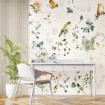 Suluboya Kuş, Çiçek ve Kelebek Desenli Duvar Kağıdı