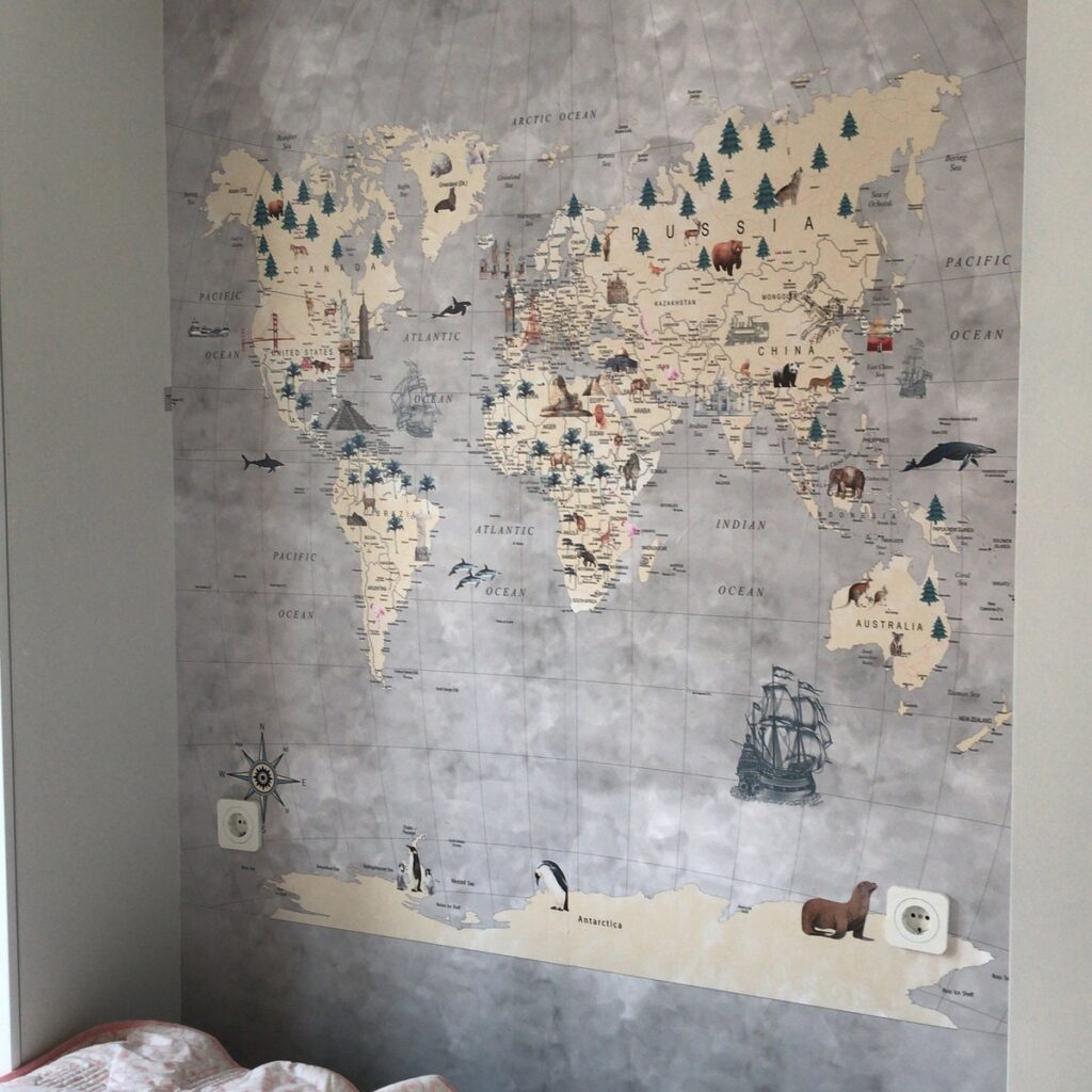 Dünya üzerindeki hayvanlar ve ünlü anıtları gösteren bu detaylı dünya haritası duvar kağıdı, çocuk odaları ve oyun odaları için hem eğitici hem de şık bir atmosfer yaratır. Modern gri arka planı ve sıcak tonlardaki tasarımı ile mekanlara sofistike bir hava katarken, çocukların öğrenmesini de destekler. Kendinden yapışkanlı vinil veya geleneksel tutkallı malzeme seçenekleri sunulur. Yüksek çözünürlüklü baskı kalitesi ve özel ölçü imkanı mevcuttur.